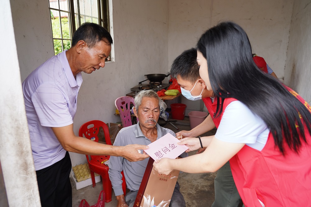 在潭震村,慰问组到困难群众家中探访,贴心询问他们的身体状况及需要帮助解决的实际困难,并送上了大米、食用油和月饼等节日慰问品。